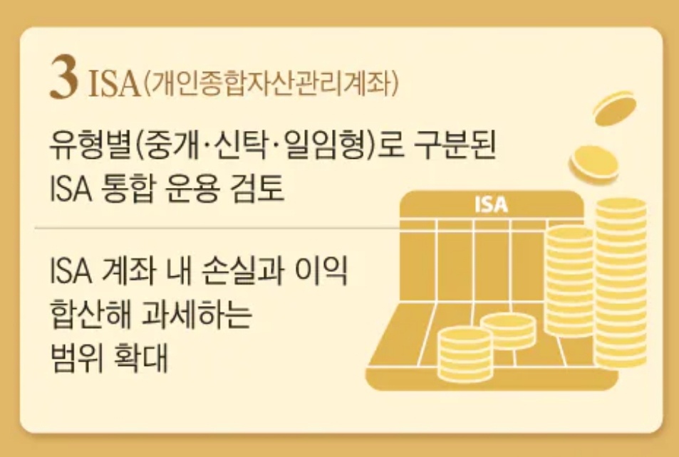 여기에 더해 1인 1계좌 제한을 없애고 예·적금을 비롯해 주식과 공모형 펀드, 상장지수펀드(ETF), 리츠 등 모든 금융상품을 하나의 계좌에 담을 수 있는 방안도 마련하기로 했다. 현재는 ISA 계좌 안에서 모든 금융상품에 투자하는 데 일부 제약이 있다. 또 ISA로 투자했다가 손실 난 부분을 수익에서 뺀 뒤(손익통산) 세금을 매기는 범위도 확대하기로 했다.
