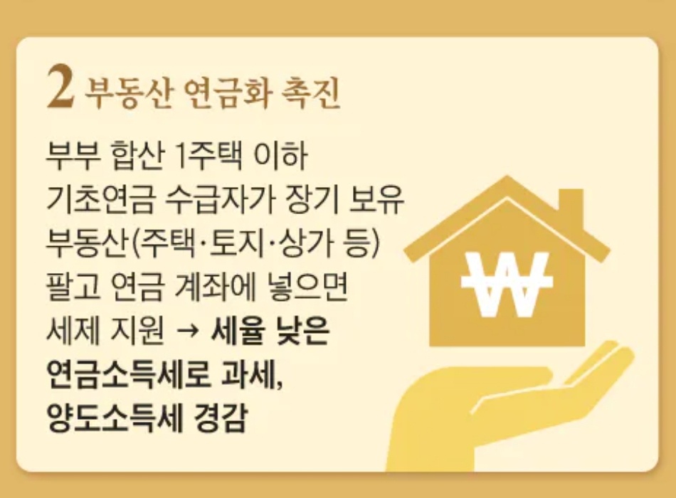 부동산을 처분해 연금으로 활용하는 고령층도 앞으로 세금을 크게 아낄 수 있다. 집을 한 채만 갖고 있고, 기초연금을 받는 65세 이상 고령층이 10년 이상 보유한 주택·토지·건물 등을 팔아서 번 돈을 IRP(개인형 퇴직연금) 등 연금계좌에 넣을 경우, 1억원까지는 이자·배당소득세보다 세율이 낮은 연금소득세를 내면 된다.