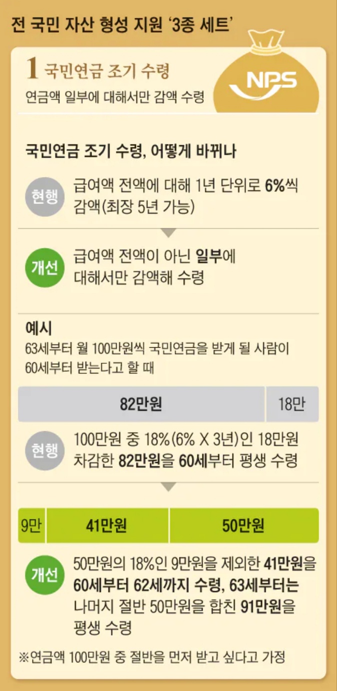 국민연금 일부 조기 수령은 퇴직 등으로 어려움에 처한 고령층의 소득을 보충해주기 위한 대책이다. 국민연금은 지금도 최대 5년 앞당겨 받을 수 있다. 하지만 연금 중 일부가 아닌 전체에 감액 비율(1년당 6%)이 적용된다. 예컨대 63세부터 월 100만원을 받게 될 사람이 3년 앞당겨 60세부터 받을 경우, 100만원 중 18%(6% X 3년)인 18만원을 차감한 82만원을 평생 받는다. 앞으로는 60세부터 100만원 중 50만원만 먼저 받고 싶다고 할 때, 50만원의 18%인 9만원을 제외한 41만원을 62세까지 받은 뒤 63세부터는 나머지 연금(50만원)을 합친 91만원을 평생 받을 수 있다.