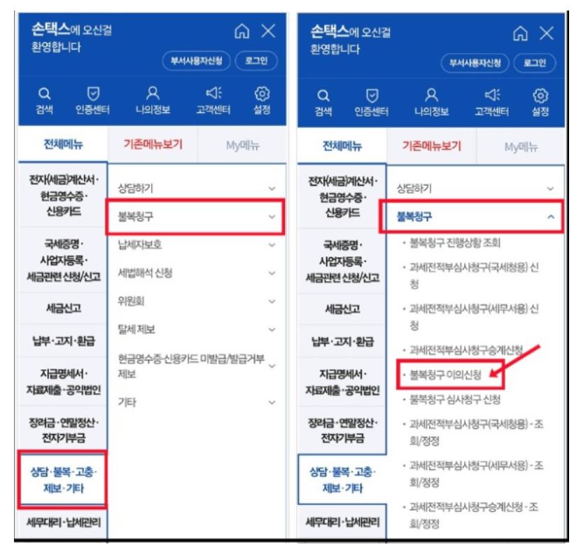 상단메뉴 ‘상담,불복,고충,제보,기타’ > 불복청구 >이의신청 페이지로 이동하여 신청가능합니다. 이의신청 접수 후 관련증빙서류를 제출하면 국세청에서 재심사를 진행하며, 평균 1~2개월 내에 결과를 통보받습니다.