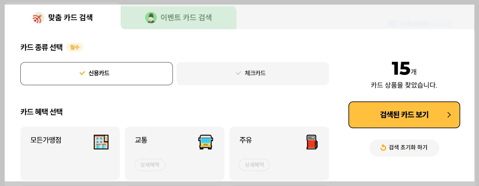 나에게 맞는 신용카드를 쉽게 추천받는 방법이 있습니다. 바로 카드고릴라, 뱅크샐러드 등의 플랫폼에서 원하는 조건으로 필터를 설정해 카드를 검색하는 건데요.이미 관심 있는 카드가 있다면, 그 카드를 목록에 담아 주요 혜택, 연회비, 전월 실적 등을 비교해 볼 수도 있습니다.
