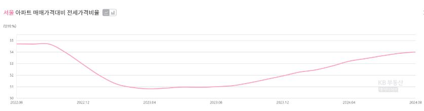 매매 가격보다 전셋값이 더욱 빠르게 오른다는 점도 갭투자를 부추깁니다. KB부동산 통계에 따르면 올해 1~7월까지 서울 아파트 매매 가격은 누적 0.02% 오른 반면, 전셋값은 3.79%나 올랐는데요. 한국부동산원 통계를 봐도 같은 기간 서울 아파트 매맷값은 1.75% 올랐지만, 전셋값은 3.1%나 올랐습니다. 이에 서울 아파트 전세가율도 21개월 연속 상승했는데요. 지난 7월 서울 아파트 전세가율은 53.9%로 2022년 11월 이후 1년 8개월 만에 최고치를 기록했습니다. 8월에는 이보다 소폭 상승한 54.0%를 기록하기도 했죠.