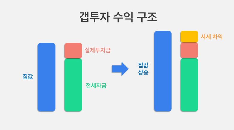 갭투자란 전세를 끼고 집을 사는 것을 의미합니다. 예를 들어, 집값이 10억 원이고 전셋값이 6억 원이라면, 집을 살 때 10억 원을 전부 치르는 대신, 전세 보증금 6억 원에 내 돈 4억 원을 더해 집을 구매하는 건데요. 이렇게 하면 비교적 적은 자본으로도 고가의 주택을 구매할 수 있습니다. 외부에서 자금을 빌려와 투자 수익률을 높이는 레버리지 투자의 일종인 셈이죠. 집주인에게 고액의 보증금을 맡기고 주택을 임차하는 전세 제도가 있기에 가능한 투자 방식입니다.