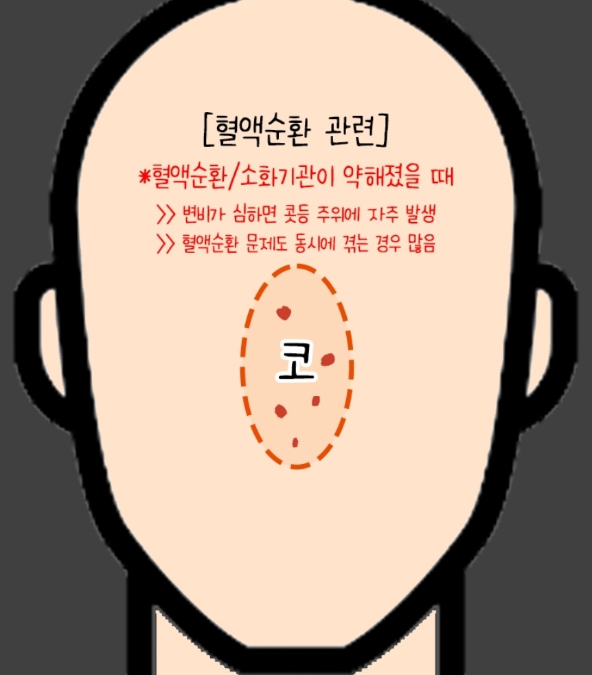 혈액순환이나 소화기관이 약해졌을 때 발생되며 변비가 심하면 콧등 주위에 자주 발생합니다.