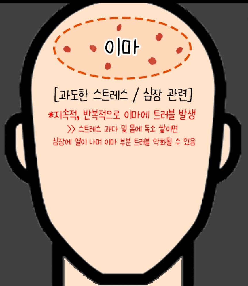 지속적, 반복적으로 이마에 트러블이 발생하면 스트레스 과다 및 몸에 독소가 쌓이고 심장에 열이 나며 이마 부분 트러블이 악화 될수 있습니다.