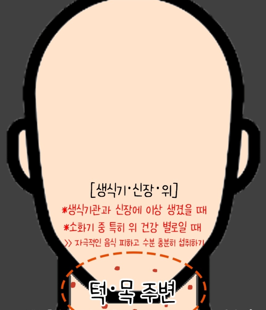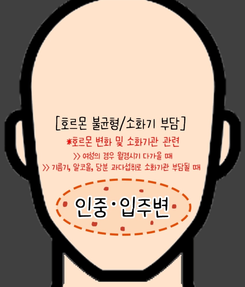 호르몬 변화 및 소화기관과 관련된 트러블 부위 입니다. 여성의 경우 월경시기가 다가올 때나 기름기, 알코올, 당분의 과다섭취로 소화기관이 부담이 될때 발생 됩니다.