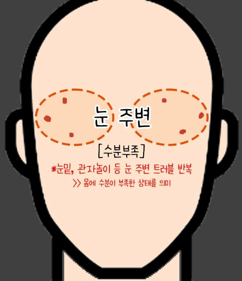 눈밑, 관자놀이 등 눈 주변 트러블이 반복되면 몸에 수분이 부족한 상태를 의미 합니다.
