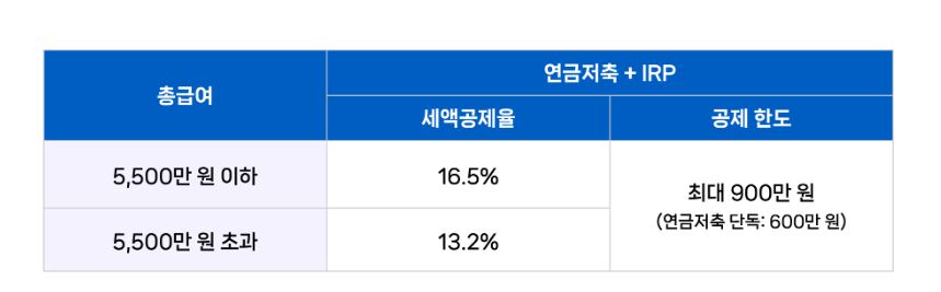 연금저축으로 세액공제를 받을 수 있는 한도가 연간 400만 원에서 600만 원으로 늘어났습니다. 개인형 퇴직연금(IRP)에도 돈을 넣으면 연금저축과 합해 최대 900만 원까지 세금 혜택을 받을 수 있습니다.