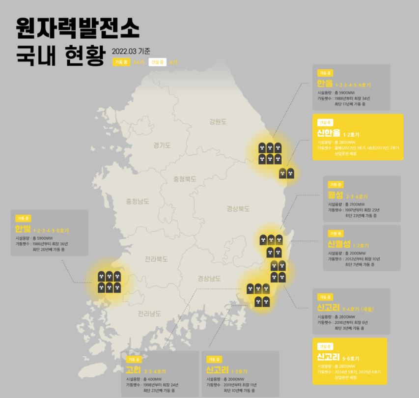 우리나라는 1970년대 두 차례 글로벌 석유파동을 겪으면서 에너지 자립의 중요성을 절감하게 됐는데요. 1978년 우리나라 최초의 상업 원전인 고리1호기가 가동을 시작하면서 '원자력의 시대'가 열렸습니다. 이후 우리나라는 원전 기술을 빠르게 발전시키면서 원자력 발전 비중도 크게 높여왔는데요. 2022년 기준 현재 우리나라에는 총 4곳의 원자력 발전소가 존재하고, 각 발전소마다 5~7기의 원전이 가동 중에 있습니다. 현재 총 24기의 원전이 가동되고 있으며, 이들 원전이 전체 전력 생산의 30%가량을 책임지고 있습니다.