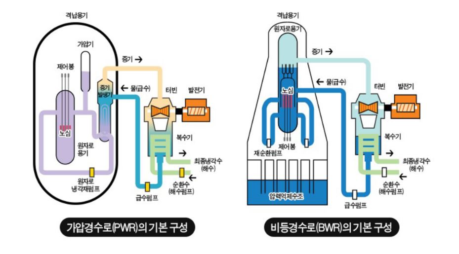 원전은 증기를 발생시키는 방식에 따라 가압경수형 원전과 비등경수형 원전으로 나뉘어 집니다. 우리나라의 원전은 거의 대부분이 가압경수형 원전으로, 보통 가압경수형 원전이 비등경수형 원전보다 안전한 편에 속하는데요. 사상 최악의 원전 사고였던 체르노빌 사고나 후쿠시마 사고가 발생했던 원전들은 모두 비등경수형 원전이었습니다.