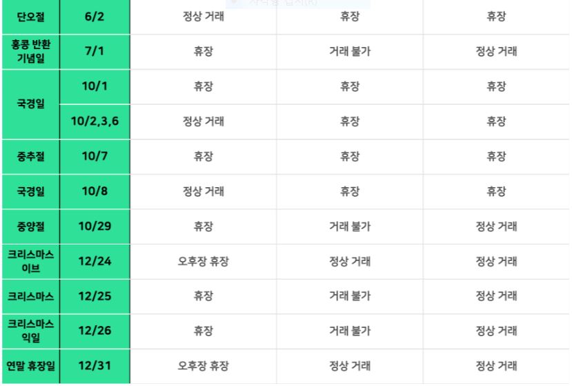 당연히 휴장일도 우리나라와 다릅니다. 홍콩, 상해, 심천 증권 거래소와 더불어 선강퉁, 후강퉁의 휴장일도 신경 써야 하죠.