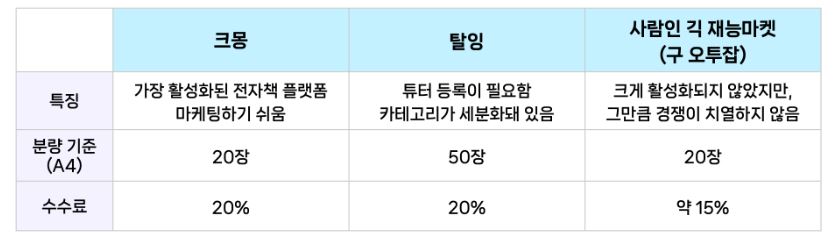 크몽, 탈잉, 사람인 긱 재능마켓 등에서 전자책을 판매할 수 있음. 플랫폼마다 수수료와 독자 성향 등이 다른데요. 사실 한 곳에만 업로드하는 것보다, 모든 곳에 업로드해 접근성을 늘리는 것이 가장 효과적입니다. 또 개인 SNS가 활성화돼 있다면 수수료를 떼이지 않고 개인적으로 판매할 수도 있습니다.