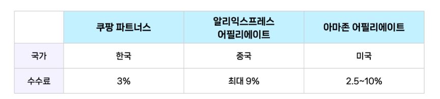 알리익스프레스 어필리에이트와 아마존 어필리에이트를 이용해볼 수 있습니다. 알리익스프레스는 중국 최대의 온라인 쇼핑 서비스입니다. 쿠팡 파트너스와 달리 평균 수수료가 7%에 달하죠. 다음으로 아마존은 미국의 대형 온라인 쇼핑 서비스인데요. 가입 후 180일 안에 3개 이상의 상품이 본인 링크를 통해 판매돼야 승인 및 수익 창출이 가능합니다. 수수료는 2.5~10%입니다.