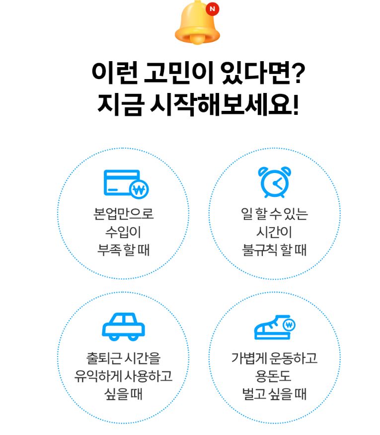 배민커넥트와 쿠팡이츠 배달파트너가 가장 유명합니다. 활동 전에는 안전 교육을 받아야 하고 간단한 테스트도 거쳐야 하죠. 오토바이가 아니어도 도보, 자전거, 킥보드 등 다양한 운송 수단으로 배달할 수 있습니다. 본인이 원하는 시간에 일할 수 있다는 것도 장점이죠.