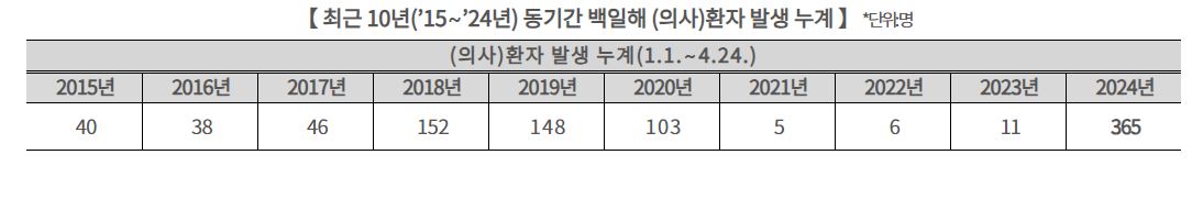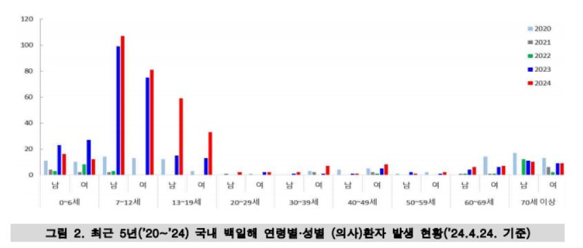 올해 백일해 환자는 (4.24기준) 365명, ’23년 11명 동기간 대비 33.2배 증가 하였고 코로나 19 유행 전(2018년) 최다 발생152명보다 더 많이 발생했습니다. 전 세계적으로 아동・청소년 위주 백일해 환자 증가하고 있고 국내도 12세 이하 어린이가 59.2%(216명)로 주로 교육시설 등 집단생활 중 발생하고 있습니다.