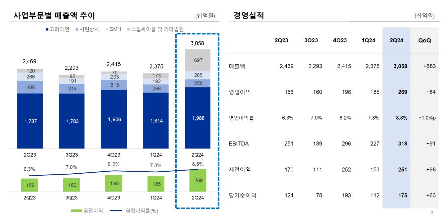 고려아연은 금속 가격과 환율 상승에 힘입어 최근 2분기 깜짝 실적을 발표했는데요. 2분기 영업이익이 2,690억 원으로 전년, 전분기 대비 급증했고, 시장의 예상치도 웃돌았죠. 영업이익률은 8.8%로 지난 1분기 대비 1% 상승했습니다. 연결 자회사 영업이익도 2022년 2분기 이후 처음으로 흑자전환에 성공했고 자회사 SMC는 생산 안정화로 아연 판매량이 늘었습니다. 더불어 서린상사는 영풍과의 저수익 계약이 종료되면서 수익성이 낮은 물량을 처리할 필요가 없어 효율성이 높아졌습니다.