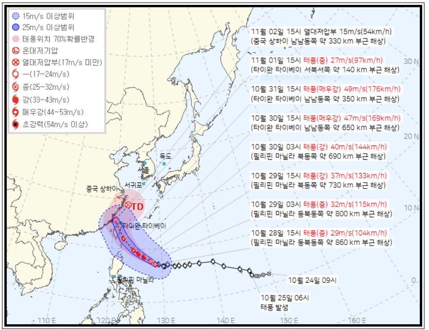 이후 31일 오전 9시쯤에는 ‘매우 강’까지 세져 타이완 타이베이 남남동쪽 60㎞ 부근 해상에 다다를 것으로 예상된다. ‘매우 강’의 강도에서는 사람이나 커다란 돌이 날아갈 수 있다고 합니다.