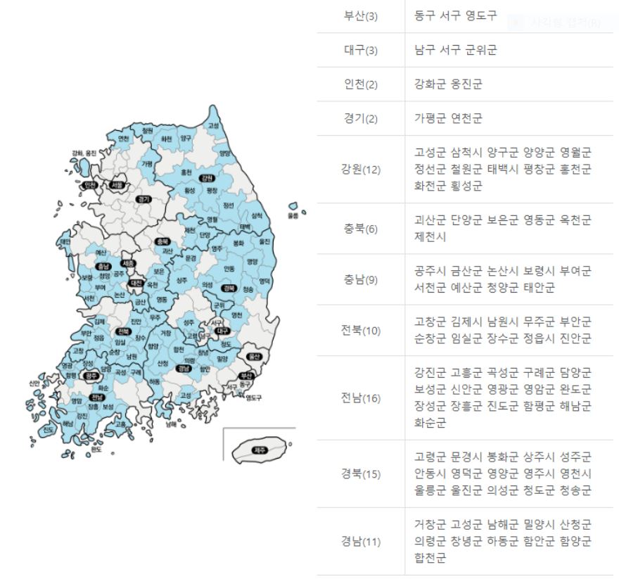 지난 2021년 10월, 행정안전부는 여러 인구 지표를 고려해 89개 시군구를 인구감소 지역으로 지정했는데요. 지정 결과는 다음과 같습니다.