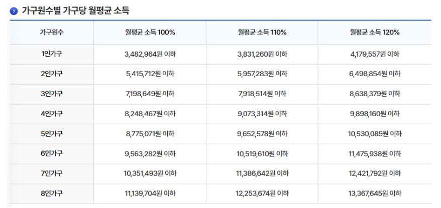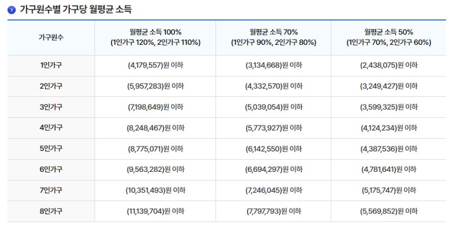 - 소득 요건: 전년도 도시 근로자 가구원 수별 월평균 소득(월평균 소득)의 70% 이하 (1인 가구는 90%, 2인 가구는 80%)