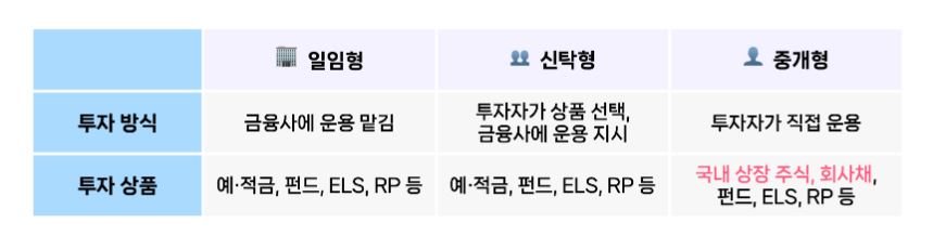 개인 투자자가 투자할 금융 상품을 고르고 구체적인 운용을 금융사에 지시하는 유형입니다. 금융사는 투자자의 선택에 따라 포트폴리오를 구성해야 합니다.