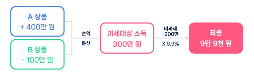 계좌 안에서 발생한 여러 상품의 이익과 손실을 합쳐, 순수익에 대해서만 세금을 내면 됩니다. 손익을 통째로 계산하는 방식이라 손익통산이라 하는데요. 예를 들어 A 상품에서 400만 원의 수익이 났고 B 상품에서 100만 원을 잃었다면, 순수익은 300만 원인데요. 비과세되는 200만 원을 빼면 100만 원이 남죠. 결론적으로 100만 원의 9.9%인 9만 9천 원만 세금으로 내면 되는 겁니다.